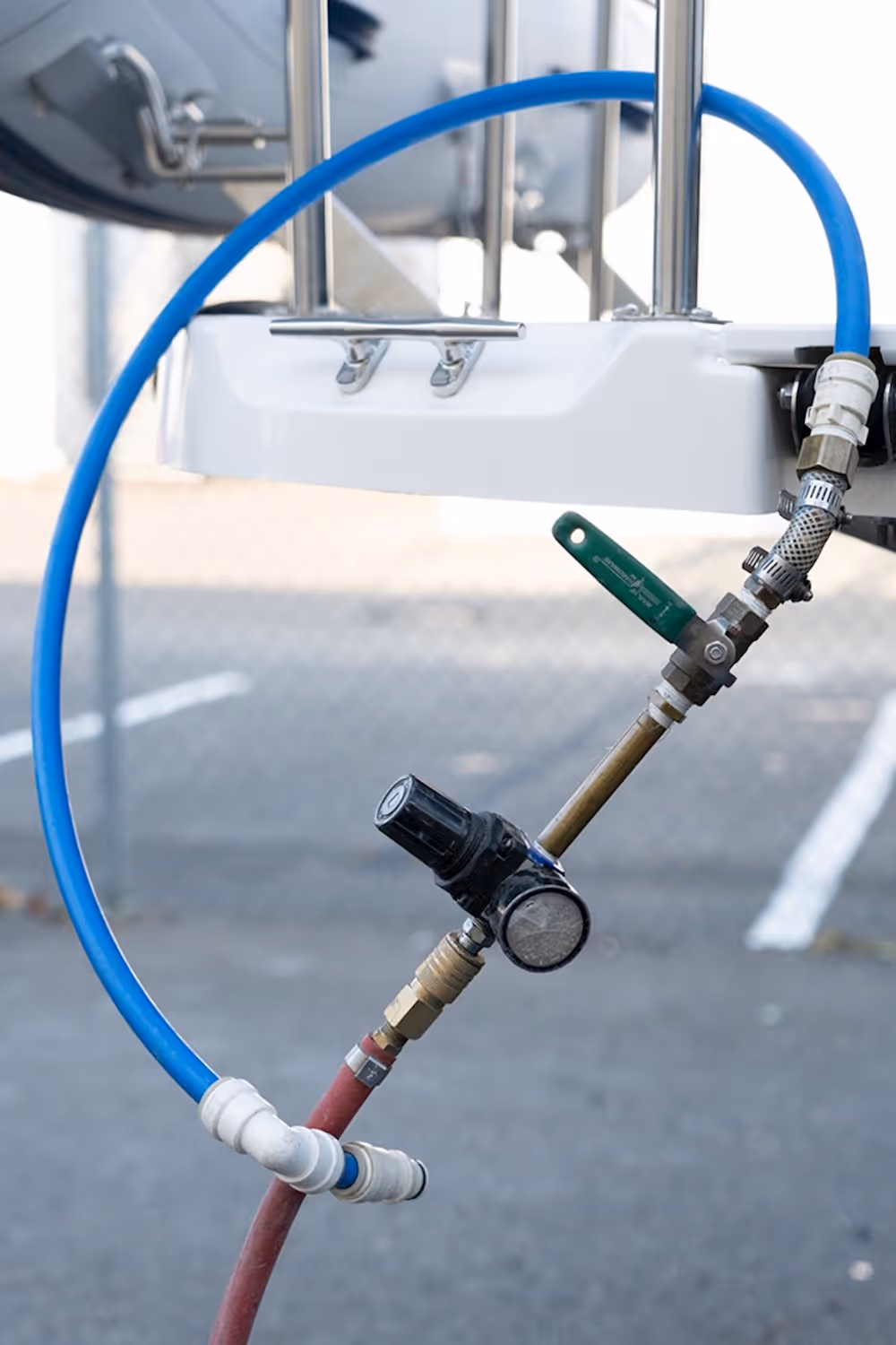 With the air valve closed, connect the air compressor to the potable water pump (also checking the device’s pressure regulator is set to no more than 20 PSI).